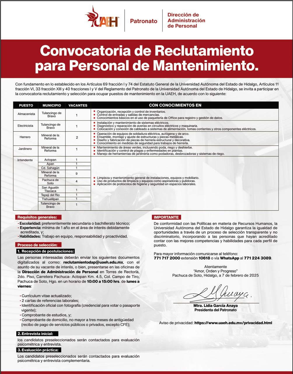 Convocatoria de Reclutamiento para Personal de Mantenimiento