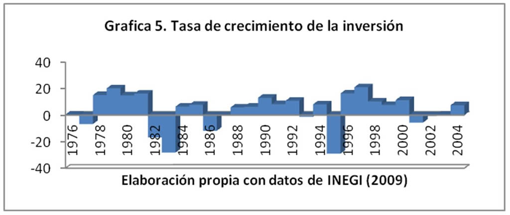 Para ofrecer una explicación de porqué la inversión se ha estancado es necesario exponer los principales factores que la determinan. En Velázquez (2009) se argumenta que el principal determinante de la inversión es la expectativa de crecimiento, debido a que si las empresas esperan que su mercado crezca entonces incrementaran su inversión para hacer frente a la mayor demanda. Una vez que la inversión se haya realizado, el crecimiento se verificará como consecuencia de la mayor inversión [20]. Este resultado es congruente con las estimaciones empíricas realizadas por Levine y Renelt (1992). En consecuencia, las bajas tasas de inversión están determinadas por las bajas expectativas de crecimiento, pero a su vez el lento crecimiento es consecuencia de la baja inversión.