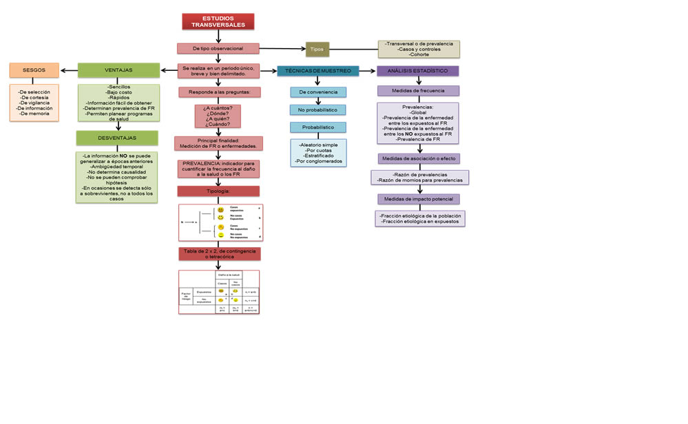 El estudio transversal es un estudio epidemiológico observacional en el que la exposición a uno o varios factores de riesgo (FR) así como la enfermedad de interés se mide de forma simultánea y en una sola ocasión. El indicador utilizado en este tipo de estudios es la prevalencia, la cual es útil para cuantificar la frecuencia del daño a la salud. Permite responder a las preguntas: ¿A cuántos?, ¿Dónde?, ¿A quién? y ¿Cuándo? Entre sus ventajas encontramos que son sencillos y rápidos de realizar, son de bajo costo y dan un perfil de la población en poco tiempo en cuanto a uno o más problemas de salud. Asimismo, son de gran importancia en la planificación de programas de salud. Su principal desventaja es la ambigüedad temporal; además, no determina causalidad y la información no se puede generalizar a épocas anteriores. Los sesgos que podemos encontrar son de selección, de información y de memoria. Las técnicas de muestreo que se utilizan son por conveniencia, probabilístico y no probabilístico. La información obtenida se organiza en una tabla de contingencia de 2x2, de las cuales podemos obtener las medidas de frecuencia (prevalencias), medidas de asociación y medidas de impacto potencial.