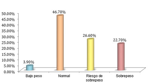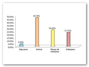 Resultados: Se observó que el 3.9% presenta bajo peso, 46.7% están dentro de los rangos de normalidad y 49.3% de la población tiene exceso de peso según el IMC. Tomando en cuenta el perímetro abdominal el 45.4% está dentro de los rangos de normalidad, mientras que el 54.5% presentan acumulación de grasa visceral, de los cuales el 29.2% cae en el diagnóstico de obesidad abdominal.