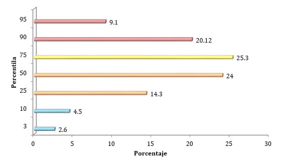Al analizar los valores de perímetro abdominal de la población, identificamos que el 7.1% se encontraban entre la percentila 3 y 10, haciendo referencia a poca o nula acumulación de grasa abdominal. El 38.1% se encuentran entre las percentilas 25 y 50, mientras que el 54.5% entre las percentilas 75 y 95 correspondiendo a una exceso en la acumulación de grasa abdominal. Gráfica 2