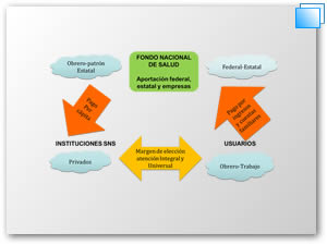 | Alemania Von –Bismarck (1883). Inglaterra: William Beveridge (1948) Servicio Nacional de salud. México:1943 se creó IMSS, SSA, ISSSTE (1960), SPSS. | Trabajador formal: derechohabientes y su familia. Población abierta: campesinos, desempleados, indigentes. | Camas censables 0.7 por mil habitantes.3 consultorios por 10 mil habitante 2.9 quirófanos por 100 mil habitantes. | Médicos 1.7 por mil habitantes Enfermeras 2.2 por mil habitantes | Ilimitada:IMSS ISSSTE PEMEX SEMAR SEDENA Limitada:secretaria de salud solo 275 intervenciones y 49 para gastos catastrófico. | La capacidad de infraestructura no ha permitido el intercambio de servicios. |