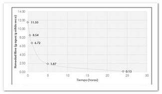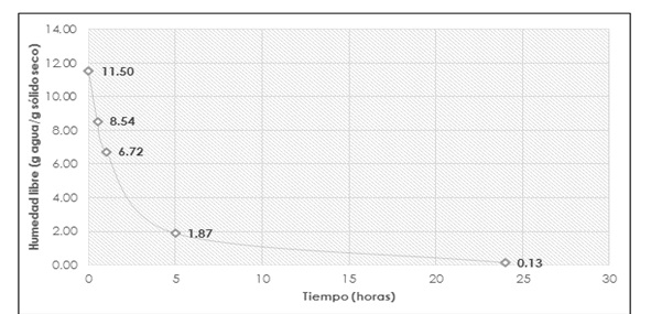 Pimientos: Se seleccionó pimiento rojo, amarillo y verde (Capsicum annuum var. annuum) obtenido de un mercado local en la ciudad de Pachuca, Hidalgo. Y aunque para estos vegetales se carece de norma, se seleccionaron aquellos que cumplían con una maduración comercial en base a su color y firmeza. Se le realizaron las siguientes operaciones para su adecuación: Lavado, escaldado a 85°C por 5 min, mondado y secado en deshidratador de alimentos de acero inoxidable (Weston) durante 12 hrs con una temperatura entre 36° y 40°C. La Figura 1, muestra la perdida de humedad del producto hasta llegar a una humedad de 0.13 g/g muestra. Posteriormente, ya seco se molió con un homogeneizador por 2 min hasta obtener partículas con un tamaño de 0,25 milímetros (tamiz Tyler N° 60) y se almaceno en bolsas de plástico con cierre hermético a temperatura ambiente (23±3°C) hasta su utilización.
