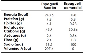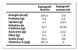El contenido nutricional del Espagueti Morrón se presenta en la Tabla 1 y se establece una comparación con espagueti comercial. El Espagueti Morrón contiene una mayor densidad energética, mayor contenido de proteína, lípidos e hidratos de carbono por la harina de amaranto adicionada.
