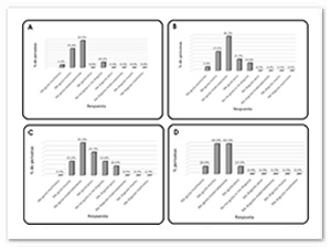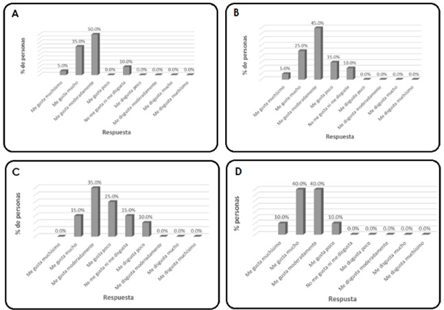 Figura 2. Evaluacion sensorial del Espagueti Morrón. A) Aceptabilidad general B)Color C)Textura D)Sabor