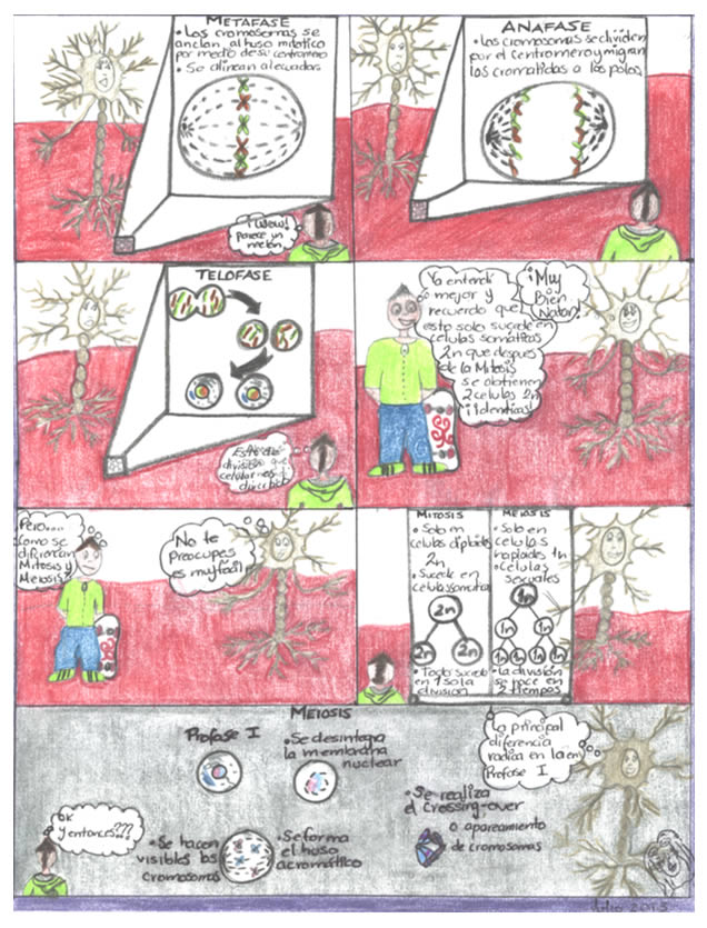 In the cellular´s metabolism, there is a process named cellular division, which becomes complex to understand because of the existance of two processes called up Mitosis and Meiosis. This is the reason to this work, wich pretends spreading an alternative to learn about cellular division, step by step, in an animated mode, hoping to benefit University´s high school community. Mitosis is the process where somatic cells, characterized for being diploid (they have a complete genetic code, with 46 chromosomes), get divided generting two similar cells; while sex cells (haploid), have only half genetic code to procreate human beings, self divide by Meiosis, generating four cels haploids.