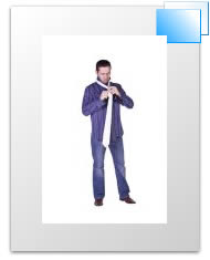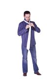 He takes a shower and gets dressed, then has a light breakfast and drives to work.