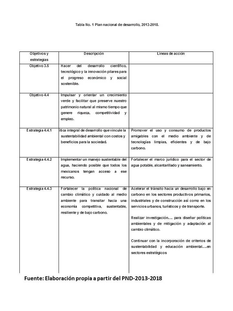 Por su parte el Plan Nacional de Desarrollo, 2013-2018, establece metas nacionales y las bases de las acciones a seguir en el corto plazo y que serán complementadas con el Programa Especial y los programas estatales de cambio climático. En la siguiente tabla se puede observar los objetivos, estrategias y líneas de acción que servirán de guía para esta investigación.