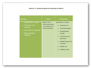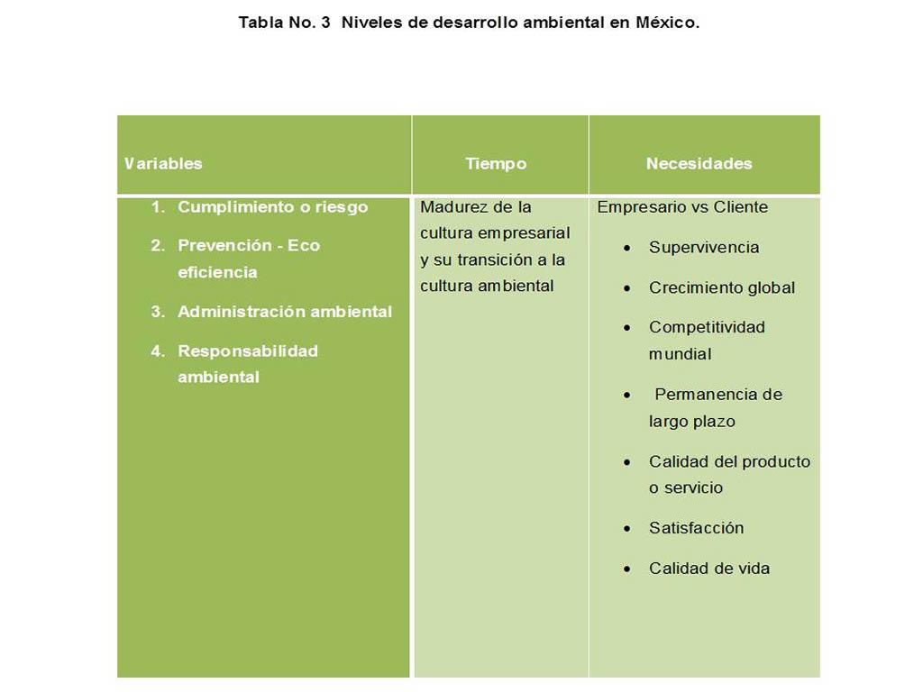 En México, considerando las investigaciones de diversos expertos en el tema, las empresas tienen diferentes niveles de desarrollo ambiental, una aproximación a identificar estos niveles se puede observar en las variables que se muestran en la siguiente tabla:
