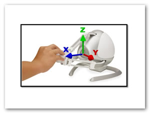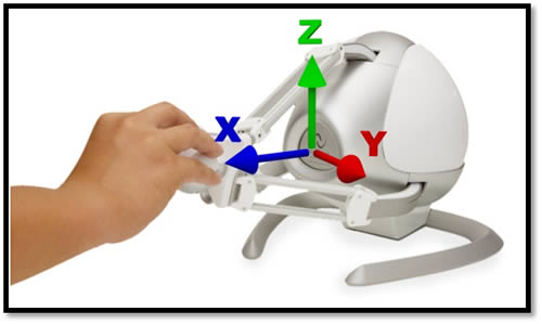 El dispositivo Novint Falcon da como salida un vector de 3 dimensiones que contiene las posiciones cartesianas X, Y y Z (metros) en la dirección que muestra la Figura 3; y como entrada, recibe un vector de fuerzas en sus componentes Fx, Fy y Fz (newton).