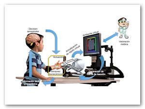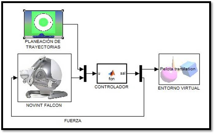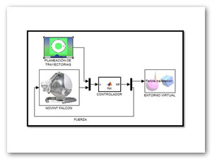 Los bloques marcados con las líneas punteadas son en los que el alumno puede trabajar y crear sus propios mundos virtuales. En cada uno de ellos aplican los conocimientos en las asignaturas de Matemáticas, Control Moderno, Teoría de Control, Robótica, Mecatrónica, Control digital, Control Inteligente, entre otras. Se le plantean al estudiante diversas problemáticas a resolver, para este artículo se le da una aplicación a la medicina, el cual consiste en diseñar un entorno capaz de diagnosticar problemas de discapacidad motriz de miembro superior y que el doctor puede proponer una terapia apropiada de acuerdo a los resultados mostrados en el sistema.
