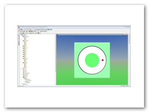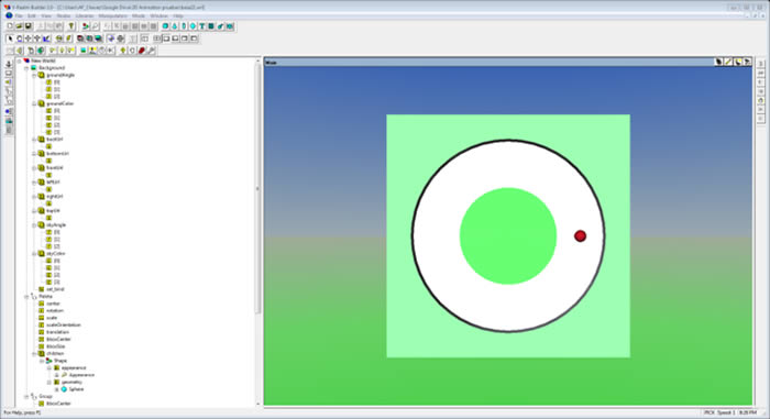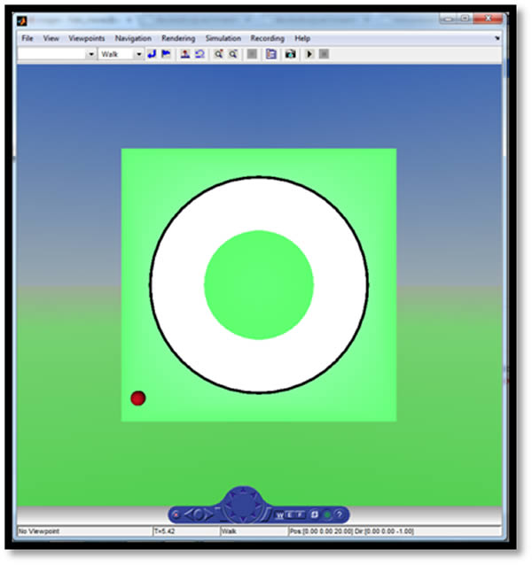 El ambiente generado se realiza en el editor V-Realm Builder 2.0, mostrado en la Figura 8, propio de la librería Simulink 3D Animation; aquí se agregan todas las componentes del entorno virtual, siempre teniendo en cuenta la referencia en el sistema cartesiano X, Y y Z, debido a que al interactuar con el dispositivo Novint Falcon éste envía un vector de posición para modificar dicho ambiente. El ambiente consiste en una circunferencia que es la base para el diagnóstico y una terapia de rehabilitación.