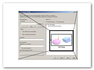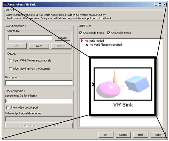 El bloque VR Sink mostrado en la Figura 7 es el empleado en este trabajo y es una librería de Simulink 3D Animation que describe valores desde sus puertos a los campos del mundo virtual especificado en el cuadro de parámetros del bloque.