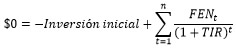 Como siguiente método de valuación de activos financieros encontramos la Tasa Interna de Rendimiento (TIR, por sus siglas) es el rendimiento porcentual anual que proporcionan los recursos invertidos en un proyecto. De un modo más formal se puede definir a la TIR como la tasa de rendimiento (o de descuento) que hace que el VPN sea igual a $0 (Coss Bu, 1981). Que es lo que buscábamos en el caso de Rafael y su incógnita. La fórmula estará dada básicamente por los mismo elementos, a excepción del 0 y que aparecen la siglas TIR.