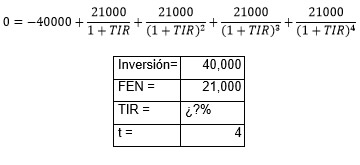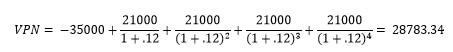 Para poner a la práctica esta forma de valuación de activos financieros, supongamos que el corredor de bolsa Rafael quiere invertir sus ganancias en una compañía con un nuevo proyecto a futuro. La empresa necesita una inyección de capital de $35,000 y está dispuesta a pagar un interés anual del 12% al inversionista durante 4 años, mientras la empresa irá recibiendo $21,000 anualmente ¿Cuál será el Valor Presente Neto de esta inversión?