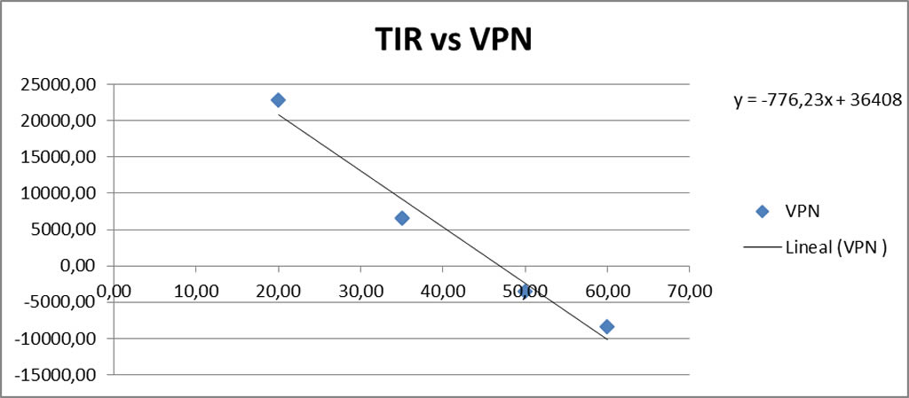 Obtuvimos un valor aproximado de la TIR de 46.90%. Más adelante veremos qué tan alejado está del valor real. Cabe aclarar que nuestra línea de mejor ajuste fue lineal dado que la naturaleza de la TIR con respecto al VPN es lineal. No podríamos intentar con una línea de ajuste exponencial, logarítmico u otra, por la relación que existe entre estos dos aspectos financieros.