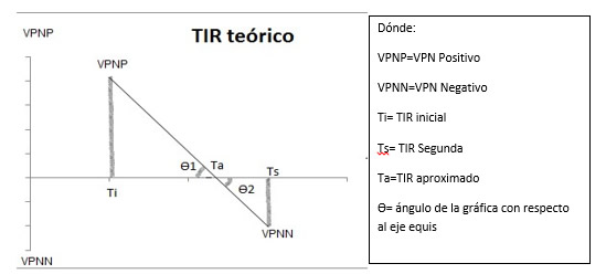 Existe un método para conseguir una aproximación del valor de la TIR que se le llama interpolación, este método está dado por una fórmula la cual vamos a intentar encontrar en base a la gráfica del comportamiento del VPN (Martin & Haese, 2012). Para llegar a la fórmula tomaremos el valor teórico de los elementos de nuestra gráfica como se muestra en la siguiente imagen: