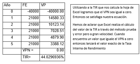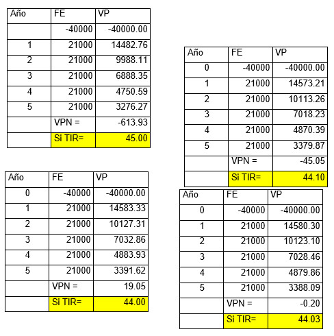 En estos cuatro intentos vimos que el VPN para un TIR de 45 resultaba negativo. Para un TIR de 44 resultaba positivo. Entonces el valor estaría entre esas dos cifras. Vimos que estaba más cercano a cero en 44, entonces intentamos con 44.10, así obtuvimos un VPN negativo. Entonces la TIR tendría que ser mayor que 44.00 pero menor que 44.10. Se intentó con 44.03 y obtuvimos un VPN negativo pero no lejano a cero. Entonces por aproximaciones sucesivas, TIR=44.03. Este valor parece ser más cercano a un valor exacto, no concuerda mucho con el que tuvimos con la gráfica, ya comprobaremos cuál fue más certero. Vemos que el resultado que arroja la aproximación sucesiva es bastante cercano a los que hemos obtenidos en los dos métodos anteriores.