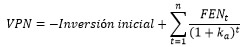 Dónde: VPN= Valor Presente Neto; FENt=Flujo de efectivo neto correspondiente al año t; ka=Costo de capital y o interés.