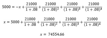 Al hacer la suma de los $21,000 de cada año en Valor Presente y restarle la inversión inicial, obtenemos un valor neto mayor a cero, lo cual hace la inversión de Rafael viable. Pero si Rafael está dispuesto a recibir el 8.7% de interés y quiere que su inversión tenga un Valor Presente Neto de $5,000, ¿Cuánto podría prestarle a la empresa?
