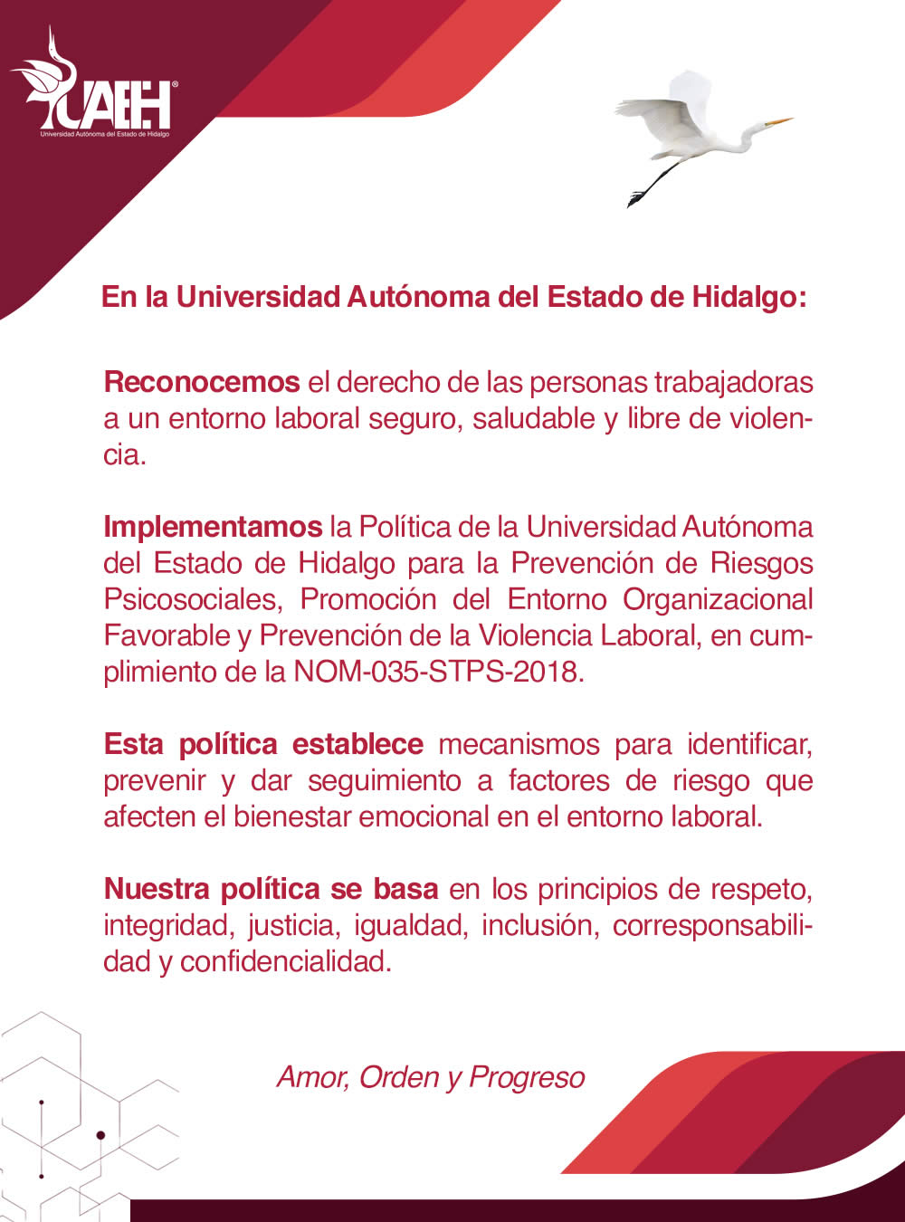 Política de la Universidad Autónoma del Estado de Hidalgo para la prevención de riesgos psicosociales NOM-035-STPS-2018
