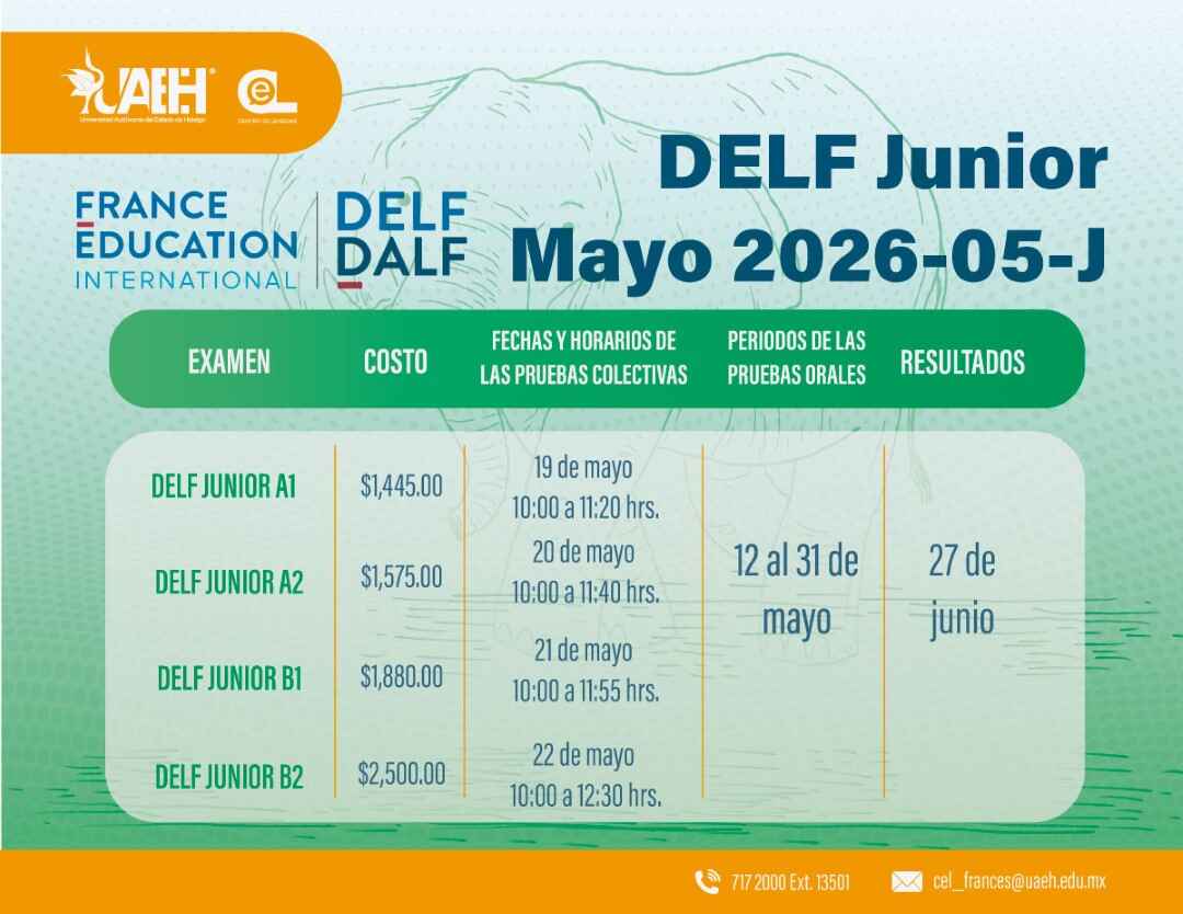 El Centro Certificador Pachuca Université Autonome, comparte información de la próxima convocatoria de la certificación internacional en lengua francesa DELF Junior - Sesión mayo 2026.
