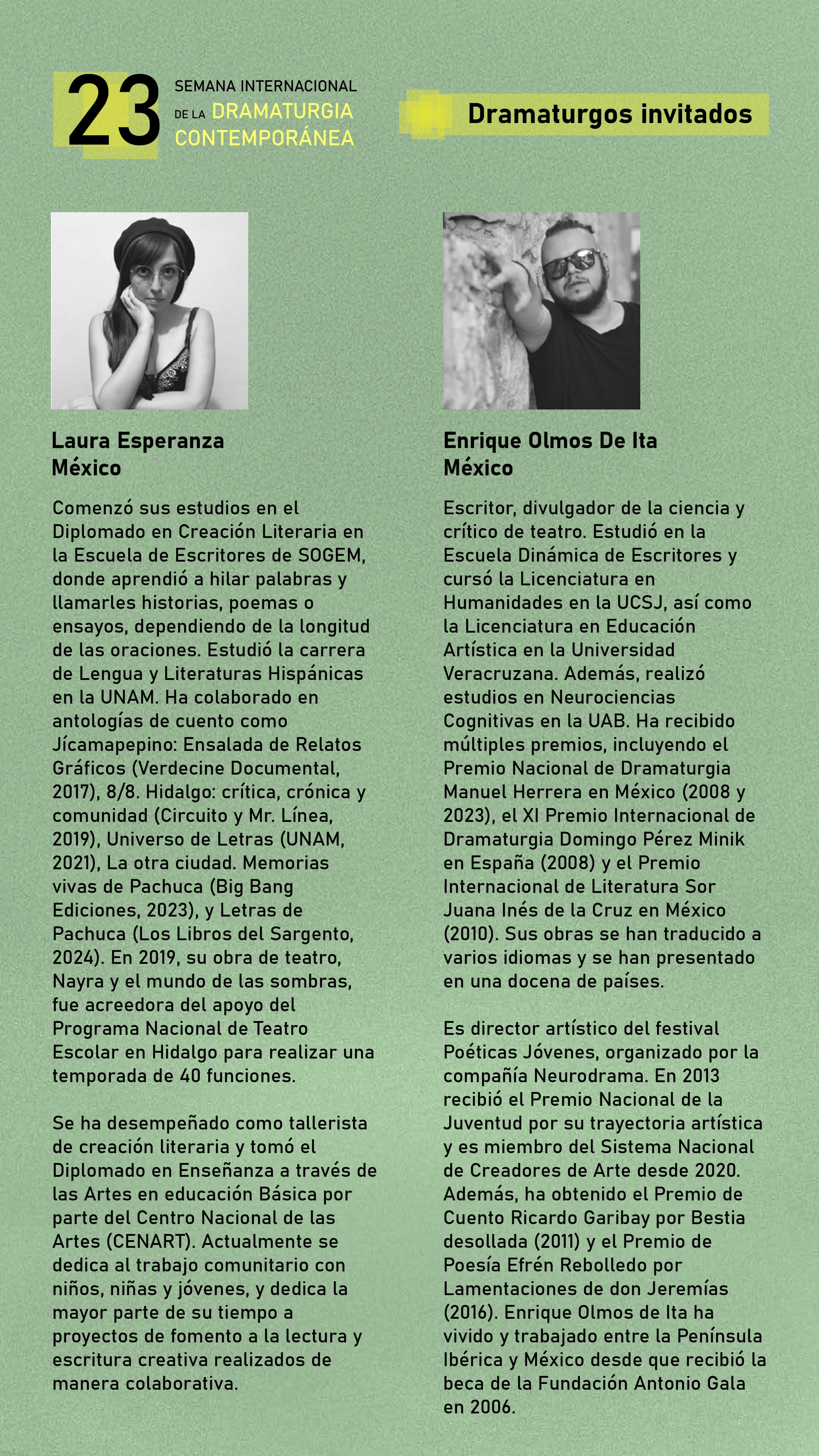 El 25 de septiembre se presentó la lectura dramatizada "Juana y la modelo pasajera" de Luis Ayhllón, bajo la dirección del Mtro. Mariano Acosta. La lectura se presentará hoy a las 16h en el Centro Cultural Universitario "La Garza", dentro de la 23 Semana Internacional de la Dramaturgia Contemporánea".
