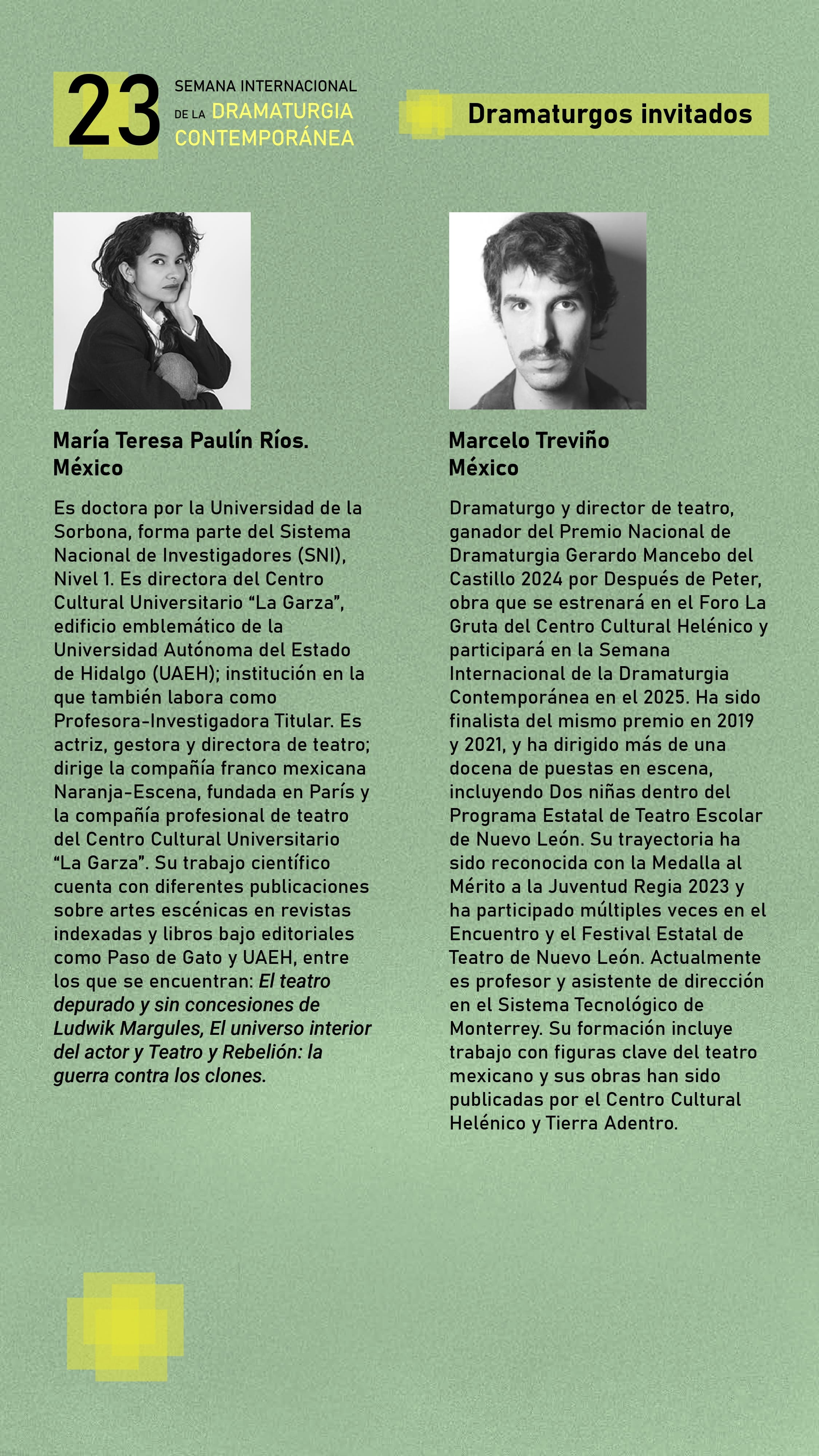 El día de hoy se llevó a cabo la conferencia de prensa sobre la 23 Semana Internacional de la Dramaturgia Contemporánea, en el Centro Cultural Universitario "La Garza"; con la participación del Coordinador de la División de Extensión de la Cultura, el Lic. Marco Antonio Alfaro Morales, el director de teatro y coorganizador Boris Schoemann, la Lic. Zuri Sadai Isidro, el Mtro. Ricardo Martín y la Directora del Centro Cultural Universitario "La Garza", la Dra. María Teresa Paulín.