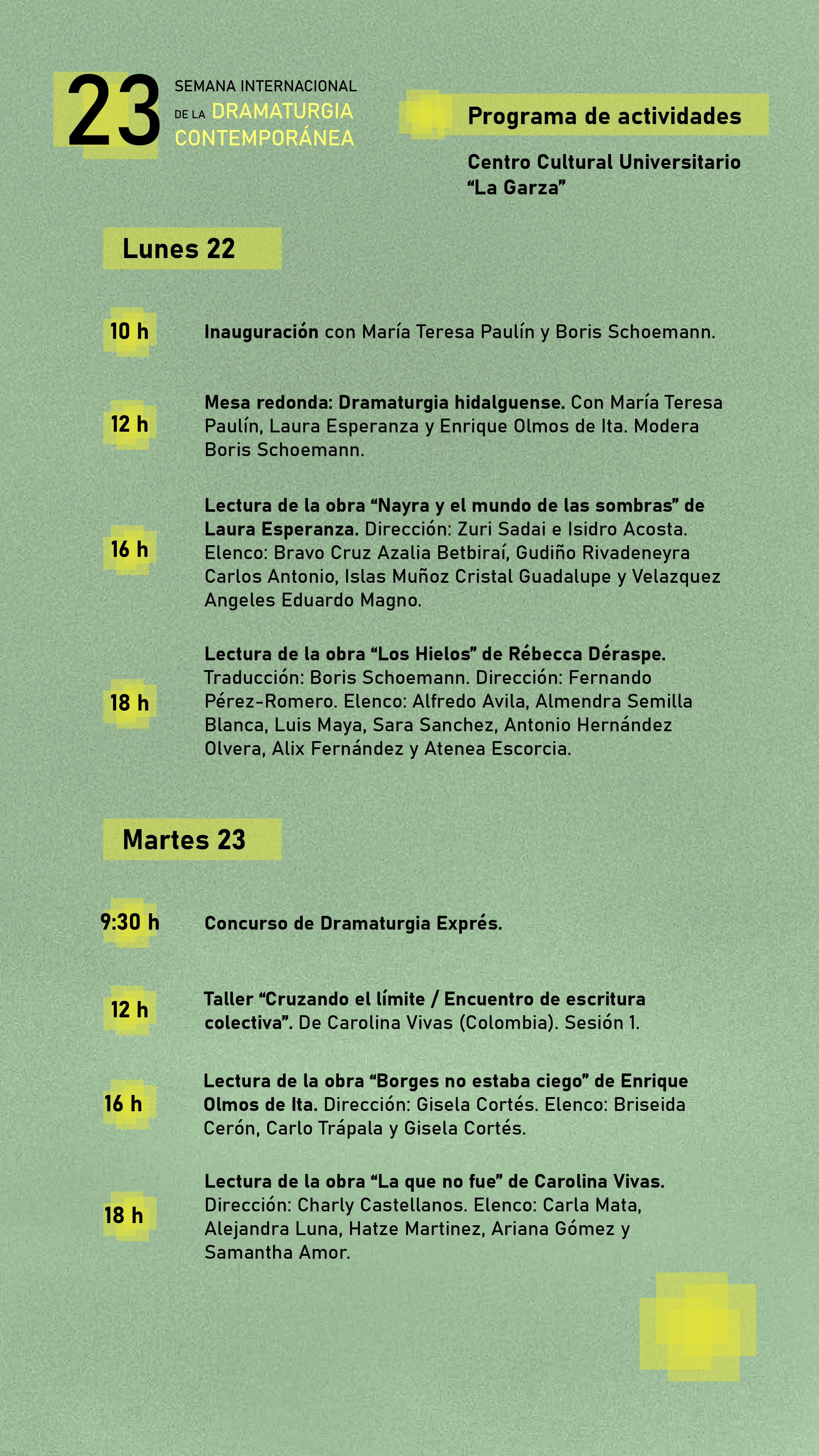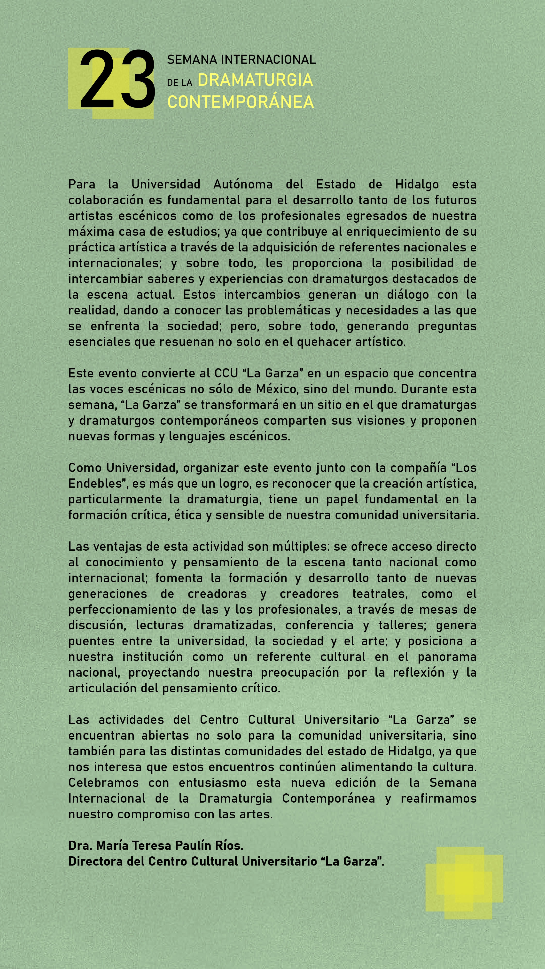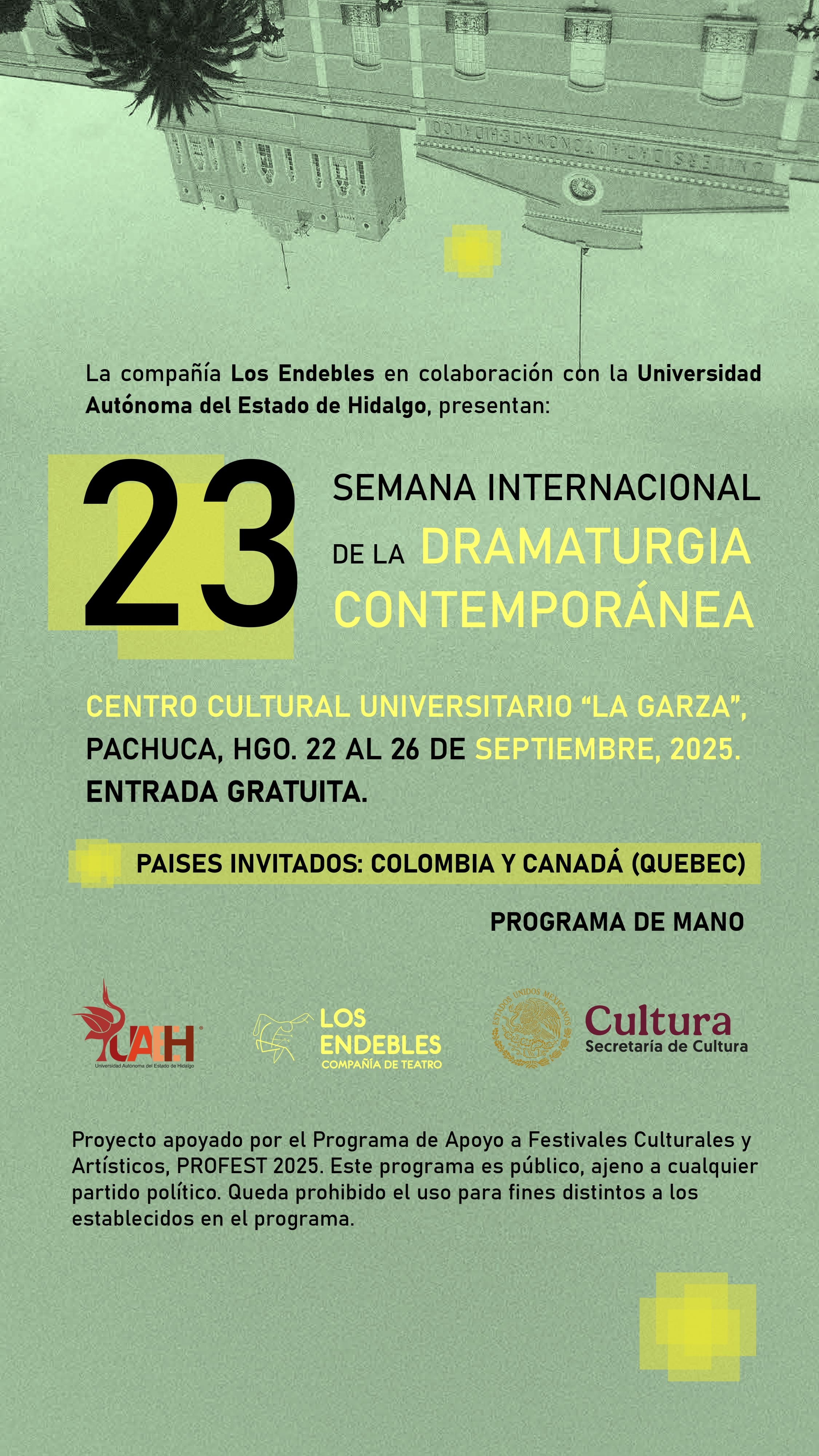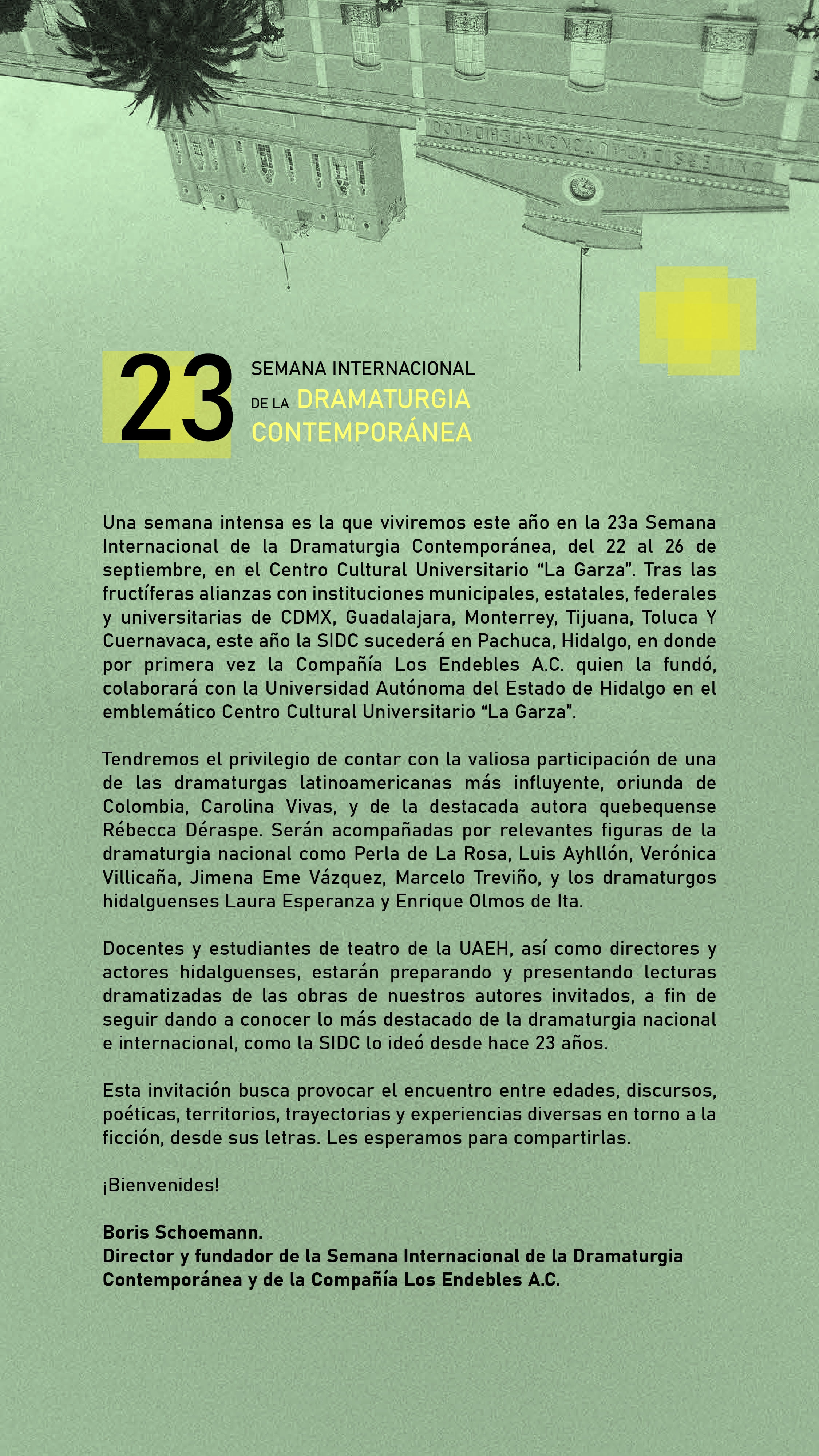 La Semana Internacional de la Dramaturgia Contemporánea (SIDC) celebrará su edición 23 y por primera vez se llevará a cabo en Pachuca, Hidalgo, en colaboración con la Universidad Autónoma del Estado de Hidalgo (UAEH).