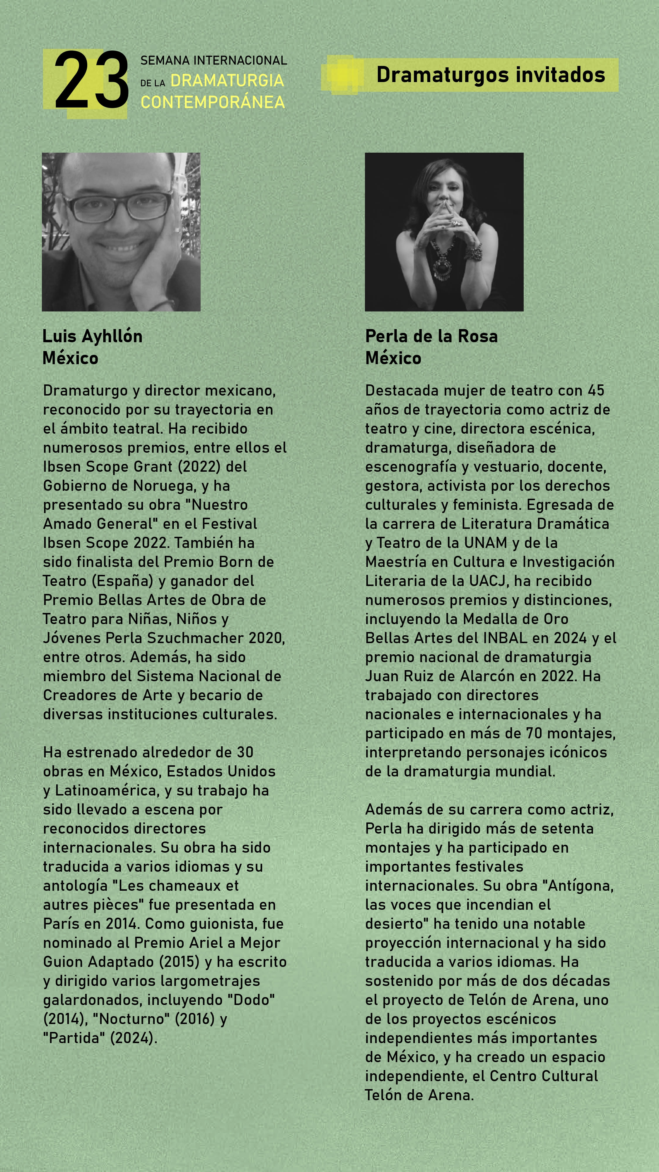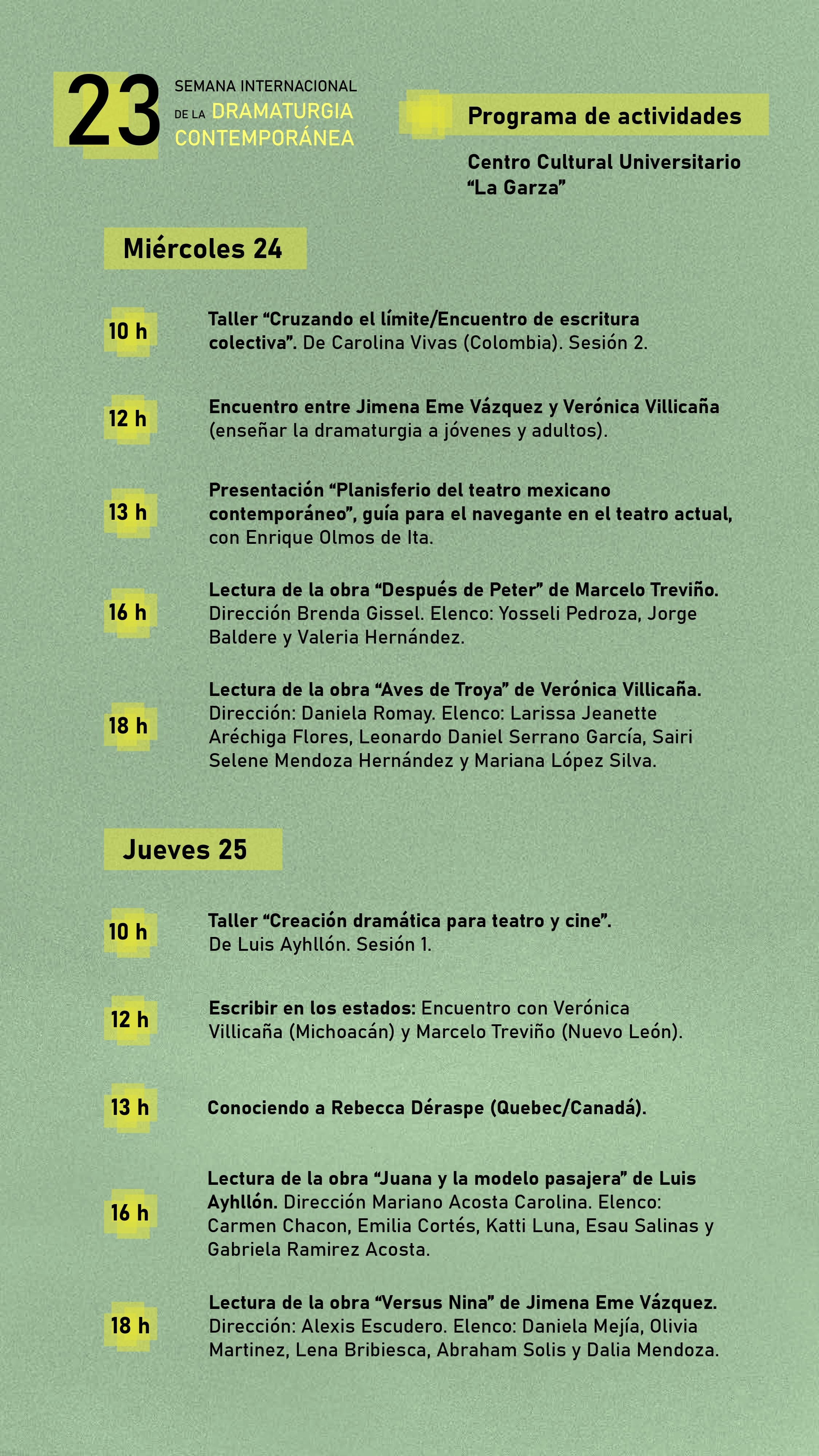 El 25 de septiembre se realizó el Taller "Creación Dramática para Teatro y Cine" de Luis Ayhllón en el Centro Cultural Universitario "La Garza"; en el marco de la 23 Semana Internacional de la Dramaturgia Contemporánea.