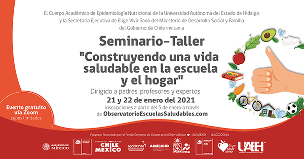 Ese escenario vuelve imperante la necesidad de atender el grave problema de salud que representa el sobrepeso en la población. Por ello la Universidad Autónoma del Estado de Hidalgo (UAEH), en conjunto con la Secretaría Ejecutiva de Elige Vivir Sano del Ministerio de Desarrollo Social y Familia del Gobierno de Chile, efectuó el Seminario-Taller “Construyendo una vida saludable en la escuela y el hogar” el pasado 21 y 22 de enero en modalidad virtual, a través del Observatorio Escuelas Saludables y la plataforma virtual de Zoom.