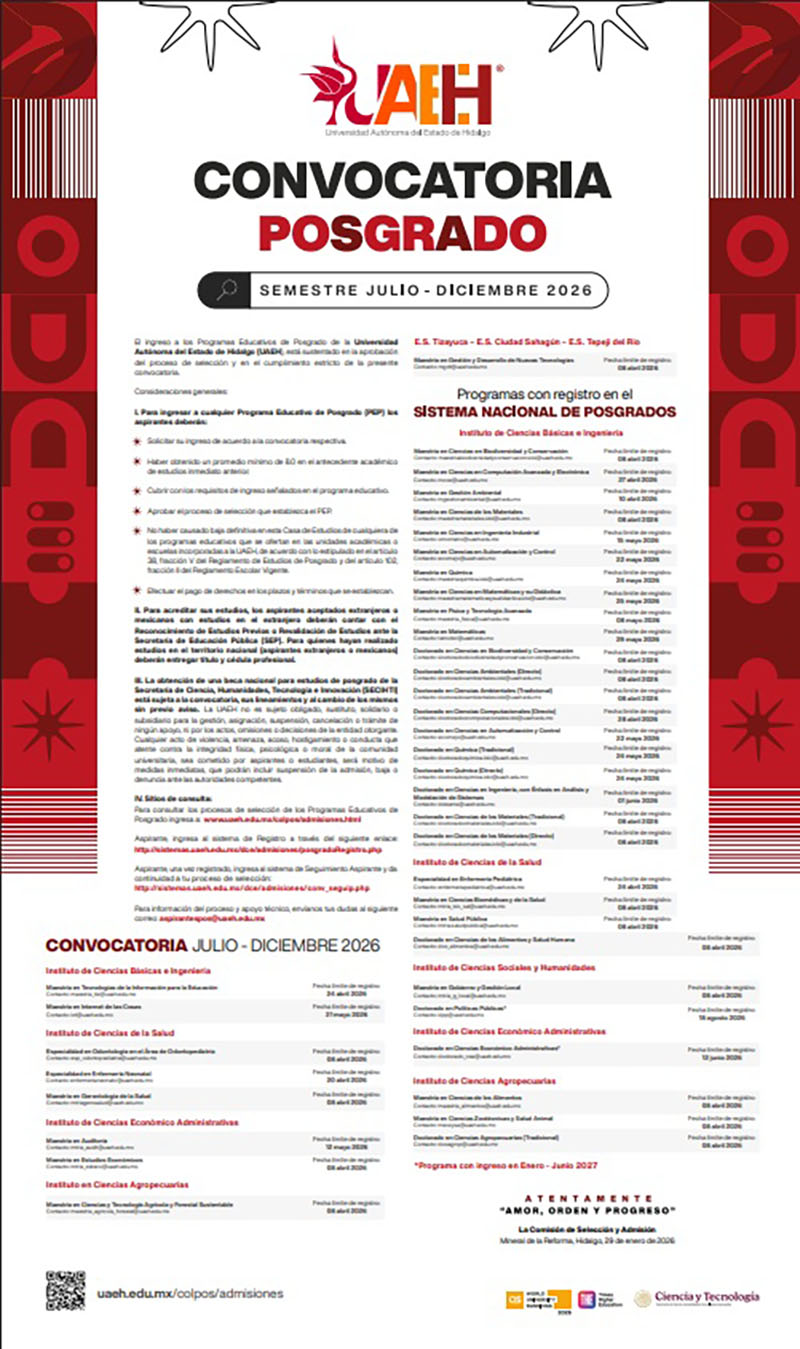 Pachuca de Soto, Hidalgo. – La Universidad Autónoma del Estado de Hidalgo (UAEH) ha abierto el registro de la convocatoria para el ingreso a sus programas de especialidad, maestría y doctorado del semestre Julio–Diciembre 2026, disponibles en las unidades académicas ubicadas en diferentes regiones de la entidad y que abarcan diversas áreas del conocimiento.