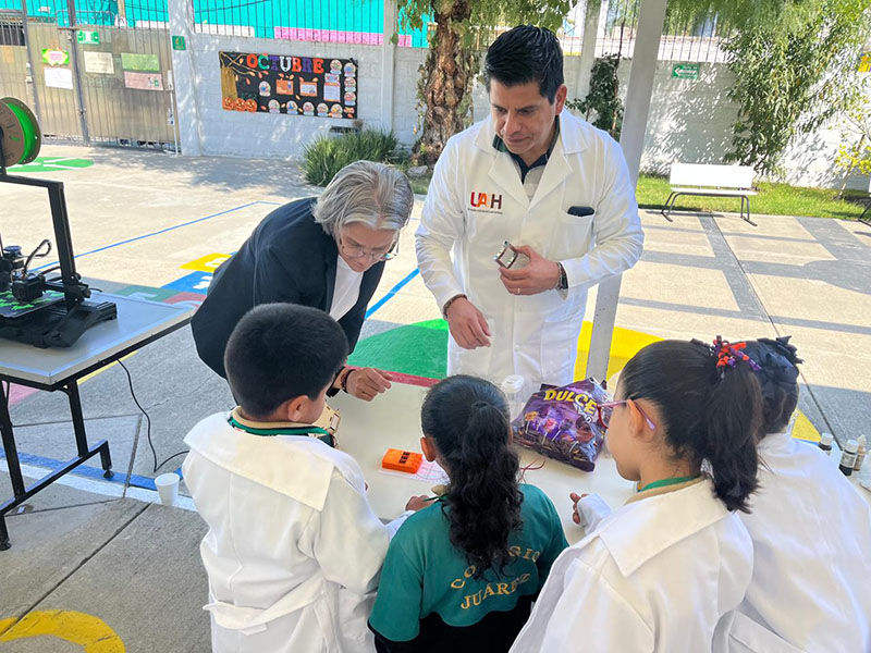 En compañía de estudiantes de licenciatura, maestría, doctorado y colegas del Instituto de Ciencias Básicas e Ingeniería (ICBI), se realizan experimentos sencillos, pero visualmente llamativos, que permiten a las infancias comprender fenómenos como la conductividad eléctrica o la creación de materiales poliméricos, despertando así su interés por disciplinas como la física, la química, las matemáticas y las ingenierías, en particular la de materiales.