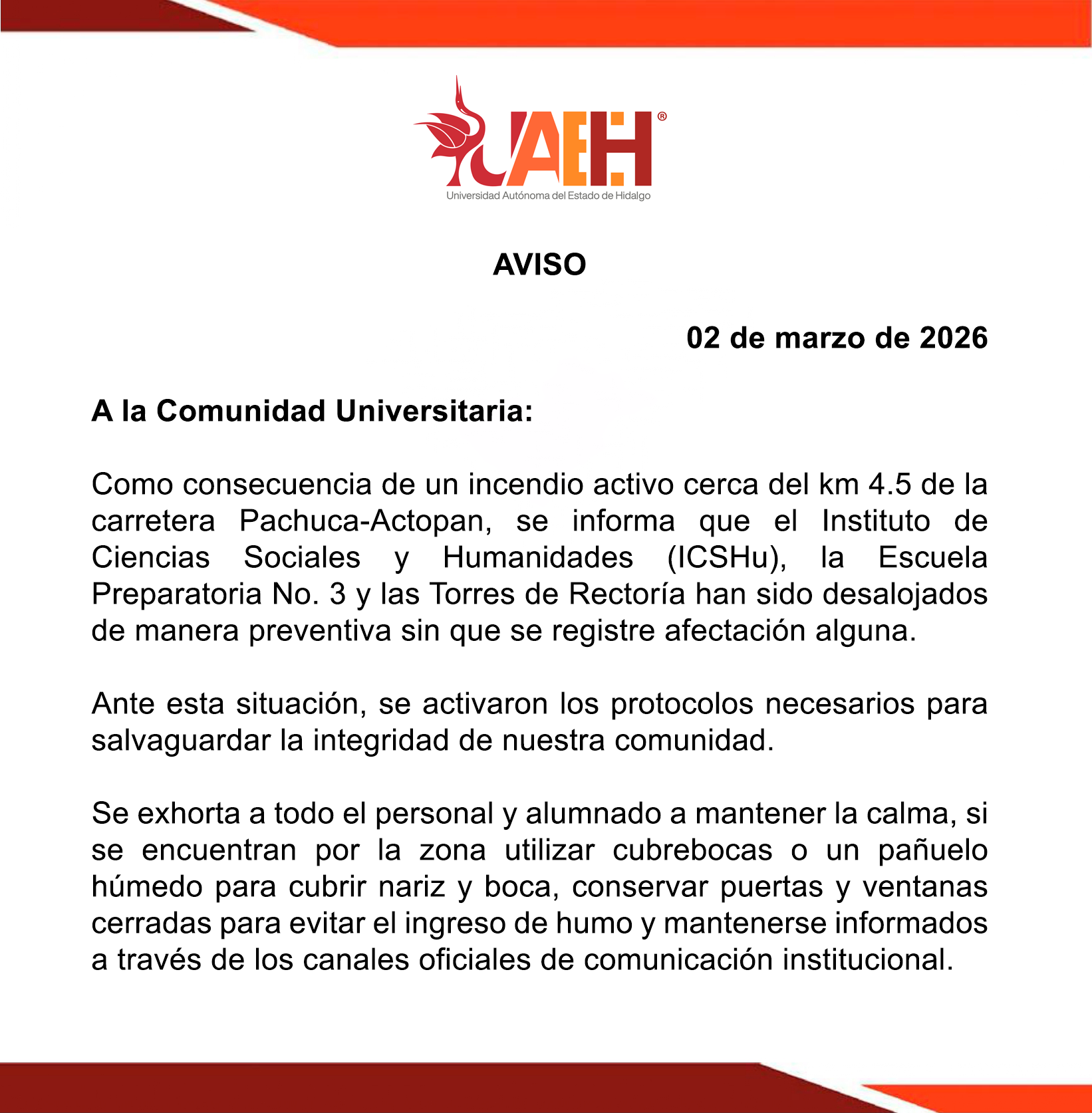 Como consecuencia de un incendio activo cerca del km 4.5 de la carretera Pachuca-Actopan, se informa que el Instituto de Ciencias Sociales y Humanidades (ICSHu), la Escuela Preparatoria No. 3 y las Torres de Rectoría han sido desalojados de manera preventiva sin que se registre afectación alguna.