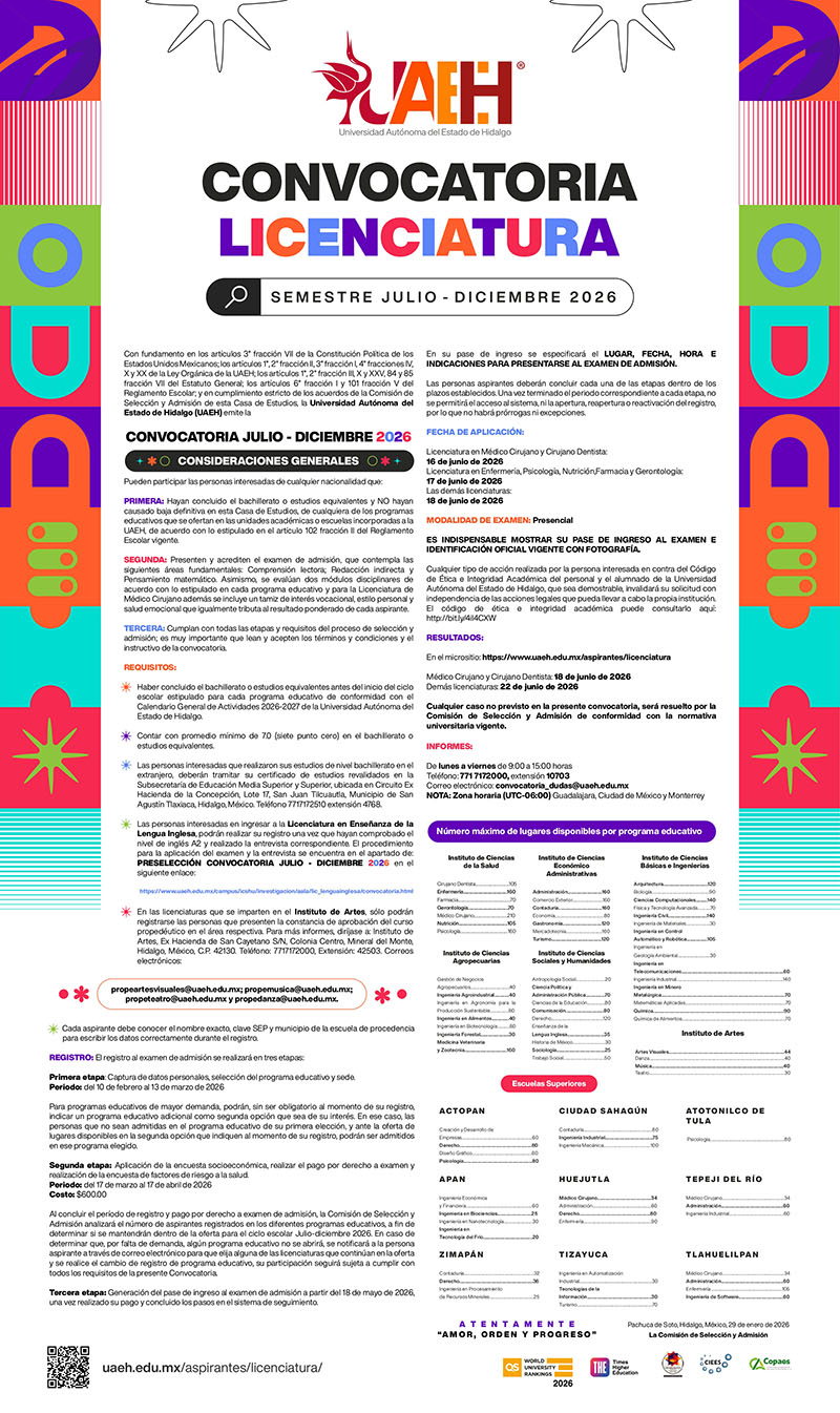 Por esta razón, resulta indispensable conocer las fechas de cada etapa para garantizar una participación exitosa y sin contratiempos. Para más detalles e ingresar al portal de seguimiento, consultar el siguiente enlace: https://www.uaeh.edu.mx/aspirantes/licenciatura/.