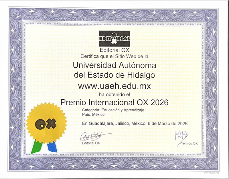 Pachuca de Soto, Hidalgo. – Durante 12 años ininterrumpidos, la Universidad Autónoma del Estado de Hidalgo (UAEH) ha recibido el Premio OX en la categoría de Educación y Aprendizaje, otorgado por la Editorial OX, institución dedicada a contribuir al prestigio, desarrollo y difusión de contenidos digitales de alta calidad.