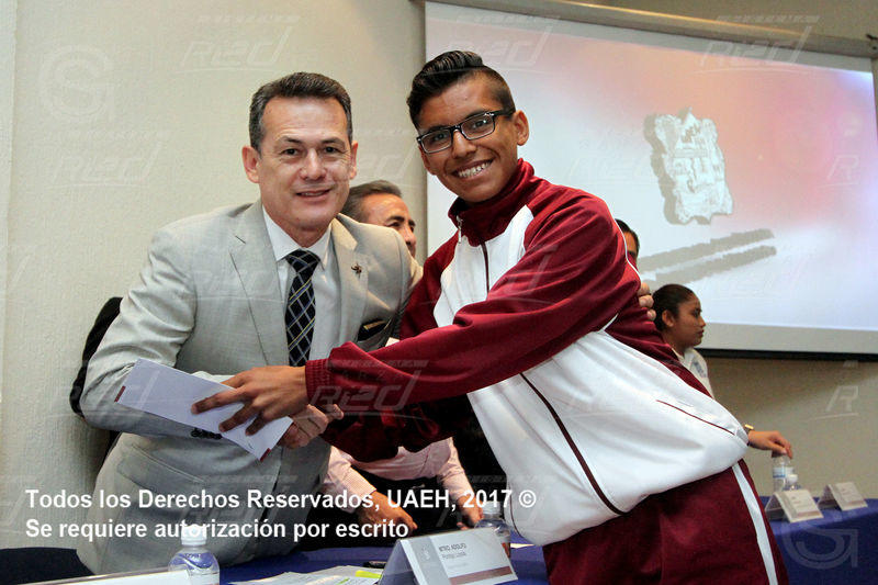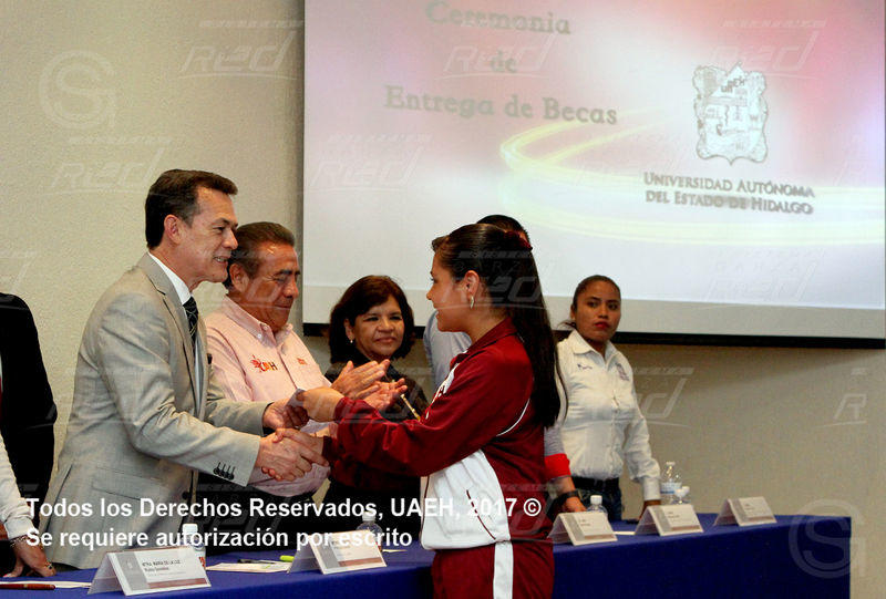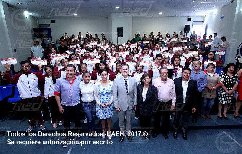 Pachuca de Soto, Hidalgo.- En el marco de la jornada de entrega de becas que realizan las autoridades de la Universidad Autónoma del Estado de Hidalgo (UAEH), 56 alumnos del Bachillerato de la Escuela Superior de Tizayuca (ESTi) recibieron de manos del rector, Adolfo Pontigo Loyola, una tarjeta bancaria con el propósito de erradicar la deserción escolar entre la comunidad estudiantil.