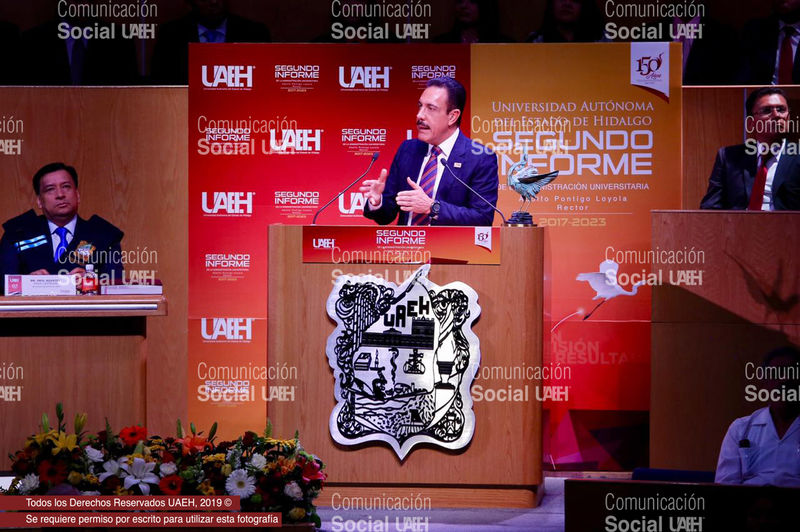 Pachuca de Soto, Hidalgo. - El rector de la Universidad Autónoma del Estado de Hidalgo (UAEH), Adolfo Pontigo Loyola, presentó el segundo informe de la Administración Universitaria 2017-2023, en una sesión solemne efectuada en el Aula Magna “Alfonso Cravioto Mejorada”, en donde señaló que en este 150 aniversario, la máxima casa de estudios de la entidad se consolida como una institución visible y reconocida a nivel global.