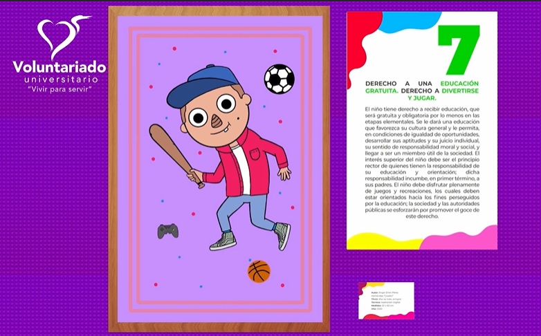 Asimismo, esta galería virtual expuso el derecho que tienen las niñas y los niños a comprensión y amor por parte de las familias y la sociedad; el derecho a una educación gratuita, a divertirse y jugar; a recibir atención y ayuda preferentes en caso de peligro; a ser protegidos contra el abandono y el trabajo infantil; así como el derecho a recibir una educación que fomente la solidaridad, la amistad y la justicia entre todo el mundo.