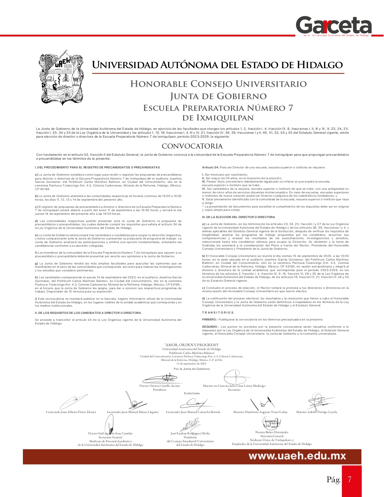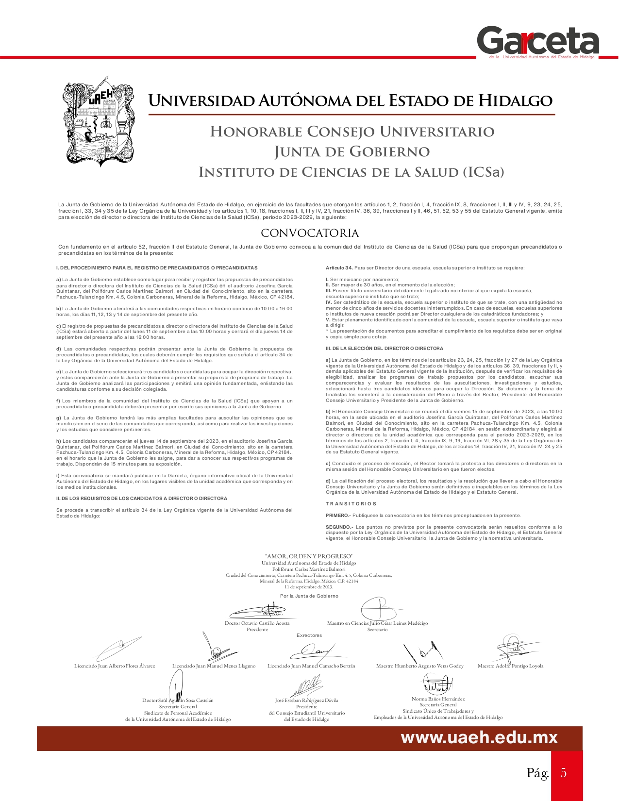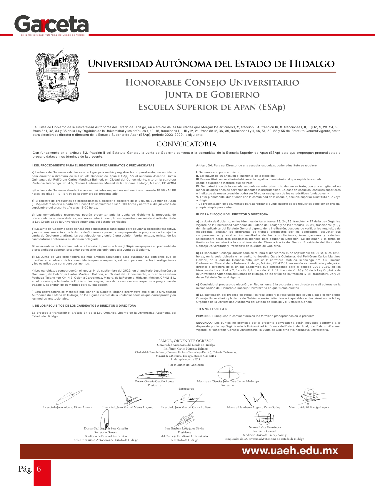Las personas interesadas en participar deberán cumplir con los requisitos que señala el artículo 34 de la Ley Orgánica de la UAEH. Posteriormente tendrán que comparecer ante la Junta de Gobierno para presentar sus programas de trabajo, a fin de que el Honorable Consejo Universitario, en sesión extraordinaria el viernes 15 de septiembre, realice la elección y toma de protesta para el periodo 2023-2029.