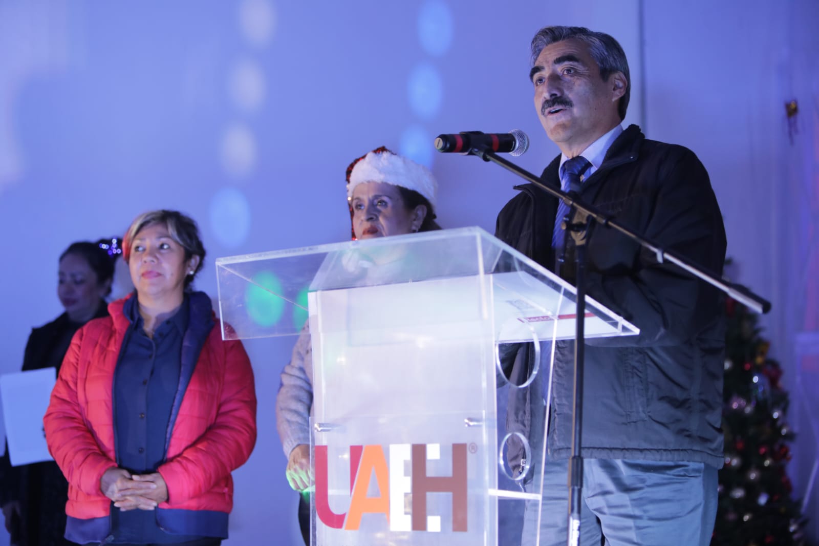 Con el encendido de cerca de 90 mil foquitos led que alumbran tanto la fachada, como los jardines y el interior del edificio, arrancó este día la temporada navideña en la Autónoma de Hidalgo a través de un evento encabezado por el rector Octavio Castillo Acosta; la presidenta del Voluntariado Universitario, Patricia Torres Samperio; y la secretaria general del Sindicato Único de Trabajadores y Empleados de esta Universidad (SUTEUAEH), Norma Baños Hernández; en compañía de directores de escuelas e institutos, familiares del personal universitario, así como niñas y niños, a quienes se dedicó el espectáculo.