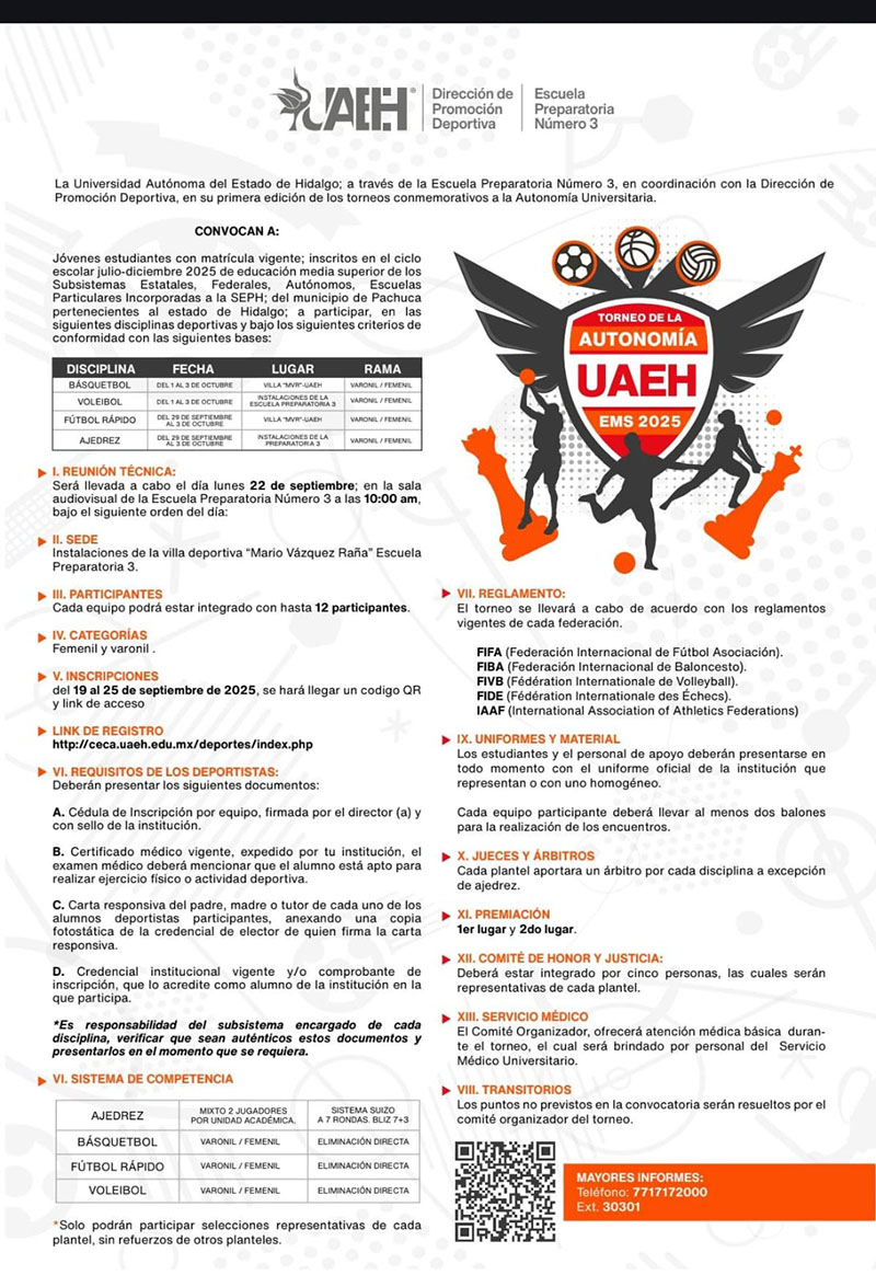 Pachuca de Soto, Hidalgo. – Del 29 de septiembre al 03 de octubre, la Escuela Preparatoria Número 3 de la Universidad Autónoma del Estado de Hidalgo (UAEH) será sede del Primer Torneo de la Autonomía Universitaria EMS 2025, que está dirigido a estudiantes de nivel medio superior de escuelas públicas y privadas de la capital hidalguense, quienes deberán estar inscritos en el semestre Julio-Diciembre de este año para competir en básquetbol, voleibol, fútbol rápido y ajedrez.