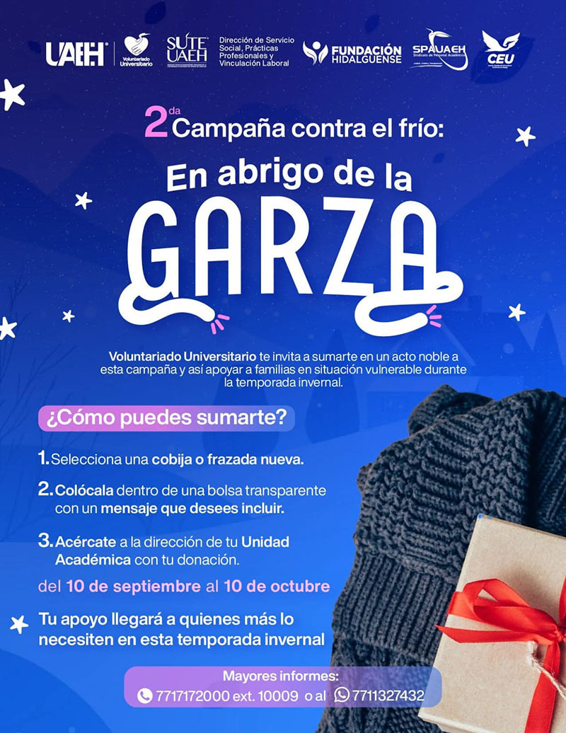 Pachuca de Soto, Hidalgo. – El Voluntariado de la Universidad Autónoma del Estado de Hidalgo (UAEH), a través de su presidenta Patricia Torres Samperio, invita a la población en general a participar en la segunda campaña contra el frío “En Abrigo de la Garza”, iniciativa que tiene como objetivo apoyar a las familias en situación de vulnerabilidad durante la temporada invernal y fomentar la conciencia social entre las y los hidalguenses.