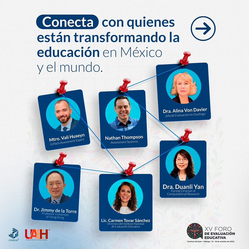 Entre las y los participantes destacan Alina Von Davier, Chief of Assessment at Duolingo; Vali Huseyn, EdTech Assessment Expert; Nathan Thompson, Assessment Systems; Jimmy de la Torre, profesor de la University of Hong Kong; Carmen Tovar Sánchez, directora del Instituto Nacional de Evaluación Educativa (INEE); y Duanli Yan, Former Director of Computational Research, entre otras personalidades.