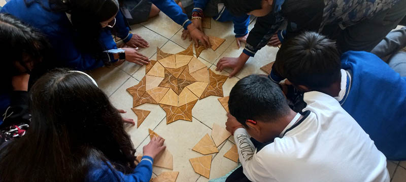 En este sentido, su fotografía “Mosaicos de Penrose”, plasma a un grupo de estudiantes de secundaria elaborando figuras geométricas formadas por flechas y cometas que permiten cubrir un plano sin superponer elementos ni dejar huecos. El propósito es que las y los alumnos aprendan mientras construyen un mosaico.