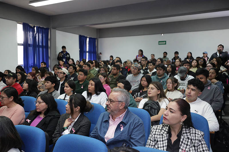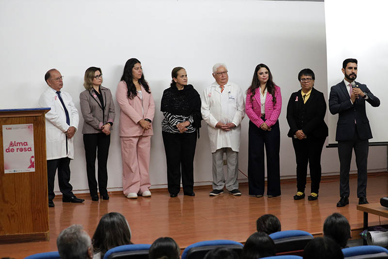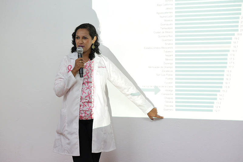 Enseguida tuvo lugar la conferencia magistral “El poder de tocar, detectar y transformar”, impartida por Andrea Esquivel Salinas, presidenta de la fundación “Una para todas”. Durante su ponencia, habló sobre el panorama del cáncer de mama, el cual es el más frecuente en mujeres a nivel mundial; en México representa el 27% de los casos de cáncer femenino, además señaló que persiste una brecha de acceso al diagnóstico y tratamiento entre diferentes regiones y grupos de edad.