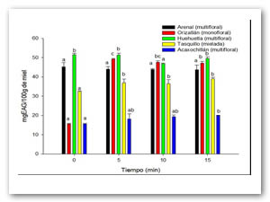 Figura 1: Efecto de ultrasonido en contenido de fenoles totales de mieles del Estado de Hidalgo