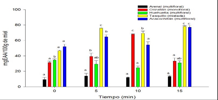 La Figura 2 muestra los resultados de la actividad antioxidante por ABTS encontrando diferencias significativas (p<0.05) en las mieles de Orizatlan, Huehuetla, Acaxochitlán y Tasquillo, aumentando su actividad antioxidante.