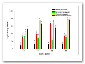 En el presente trabajo se realizó la licuación de la miel con ultrasonido y se determinó su efecto en los compuestos bioactivos y sus propiedades antioxidantes. Se evaluaron mieles cristalizadas de cinco municipios del Estado de Hidalgo como el Arenal (multifloral), Acaxochitlán (multifloral), Huehuetla (multifloral), Orizatlán (monofloral) y Tasquillo (mielada). Para la licuación de las mieles se utilizó un baño ultrasónico Branson 3510 con una frecuencia de 42KHz y periodos de tiempo de 5, 10 y 15 minutos a una temperatura de 20°C. Los parámetros fueron: fenoles totales y actividad antioxidante por (ABTS). La licuación presento diferencias significativas (p < 0.05) en fenoles totales así como en la actividad antioxidante medida como ABTS. Presentando en algunas mieles un incremento de los compuestos bioactivos y sus propiedades antioxidantes.