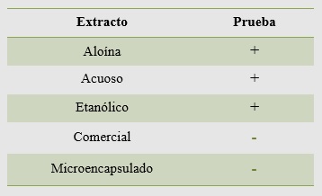 En la Tabla 1 se presentan los resultados de la reacción de Borntrager, para los 4 extractos analizados y para un estándar de Aloína (principal quinona de interés) utilizado como referencia. El estándar tras la reacción genera una coloración rosa intensa (positivo), de igual forma se obtuvieron resultados positivos en los dos extractos preparados en el laboratorio (acuoso y etanólico), ambas reacciones generaron coloraciones rosas, variando en intensidad, esto se debe a que las antraquinonas dan coloraciones en la capa alcalina de rojo a rosa y la mayoría están hidroxiladas en los carbonos C-1 y C-2, estando estas frecuentemente en forma de glicósidos, mientras que los extractos comerciales (seco y microencapsulado) dieron negativo a la prueba, obteniendo productos de reacción incoloros. Cuando se realiza un aislamiento específico, las antraquinonas se hidrolizan, obteniendo compuestos libres que pueden ser extraídos con disolventes no polares, sin embargo, cuando están en forma de glicósidos pueden extraerse fácilmente con agua, etanol o mezclas de estos[7], esto se hace evidente en ambos extractos obtenidos en el laboratorio, extrayendo así barbaloína e isobarlaloína (antronas glucosídicas) sin hidrolizar, mientras que en los extractos comerciales la prueba negativa es indicativo de la ausencia de estos compuestos, afectados por el proceso de extracción industrial, ya que desde el extracto acuoso adquirido al inicio ya hay ausencia de ellos.